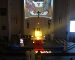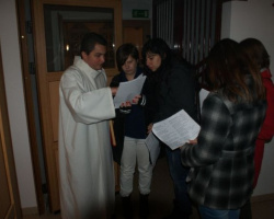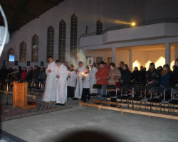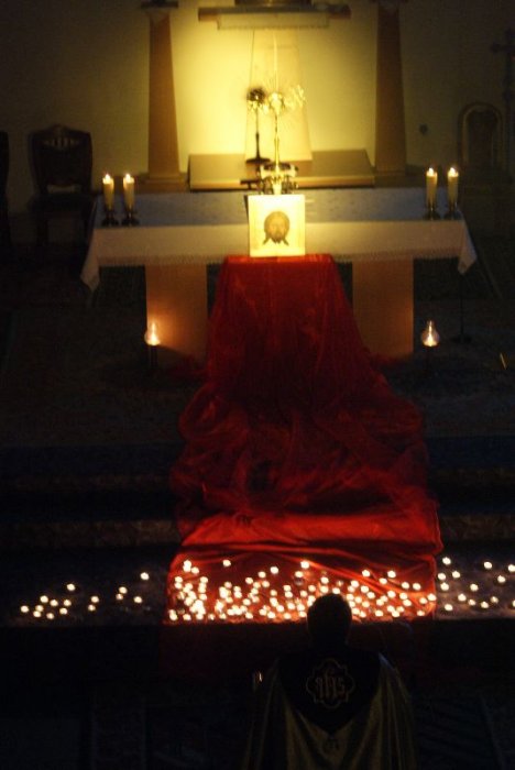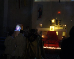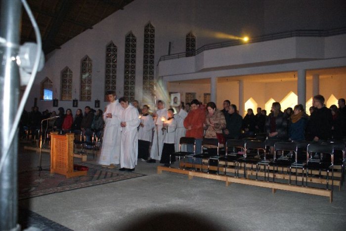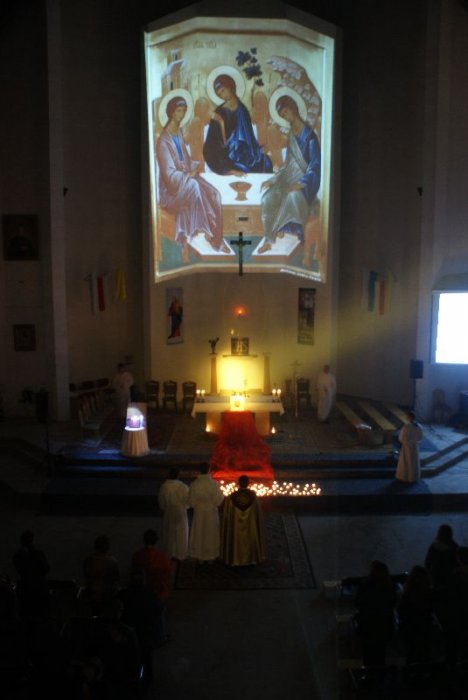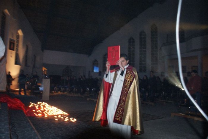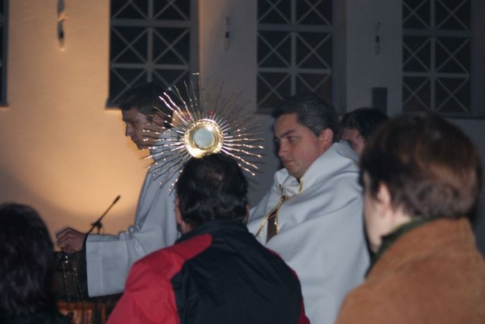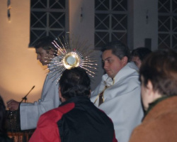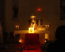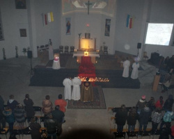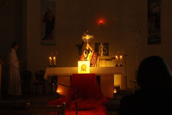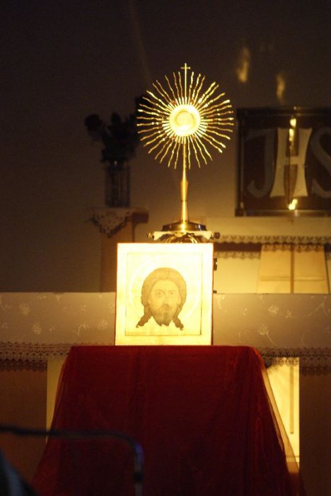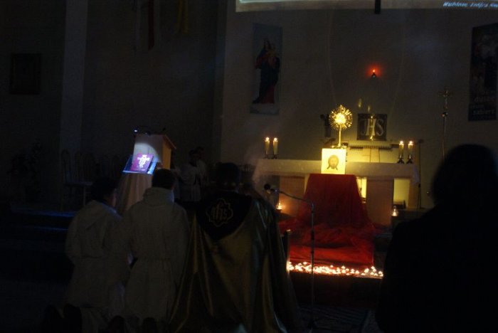 O godz. 20.00 rozpoczęło się nasze uwielbienie od procesyjnego wniesienia ikony Chrystusa i Ewangeliarza. Po wezwaniu Ducha Świętego wsłuchaliśmy się we fragment Apokalipsy św. Jana Apostoła, który został po chwili objaśniony i skomentowany słowami homilii, akcentującej przede wszystkim wymiar zwycięstwa Jezusa i czasów ostatecznych, w których żyjemy. Nakarmieni Słowem Bożym rozpoczęliśmy uwielbienie Chrystusa ukrytego w Najświętszym Sakramencie. Pomagał nam w tym zespół muzyczny połączonych sił młodzieży dwóch salezjańskich parafii pilskich: św. Rodziny i św. Jana Bosko, pod kierownictwem ks. Michała Malka SDB.